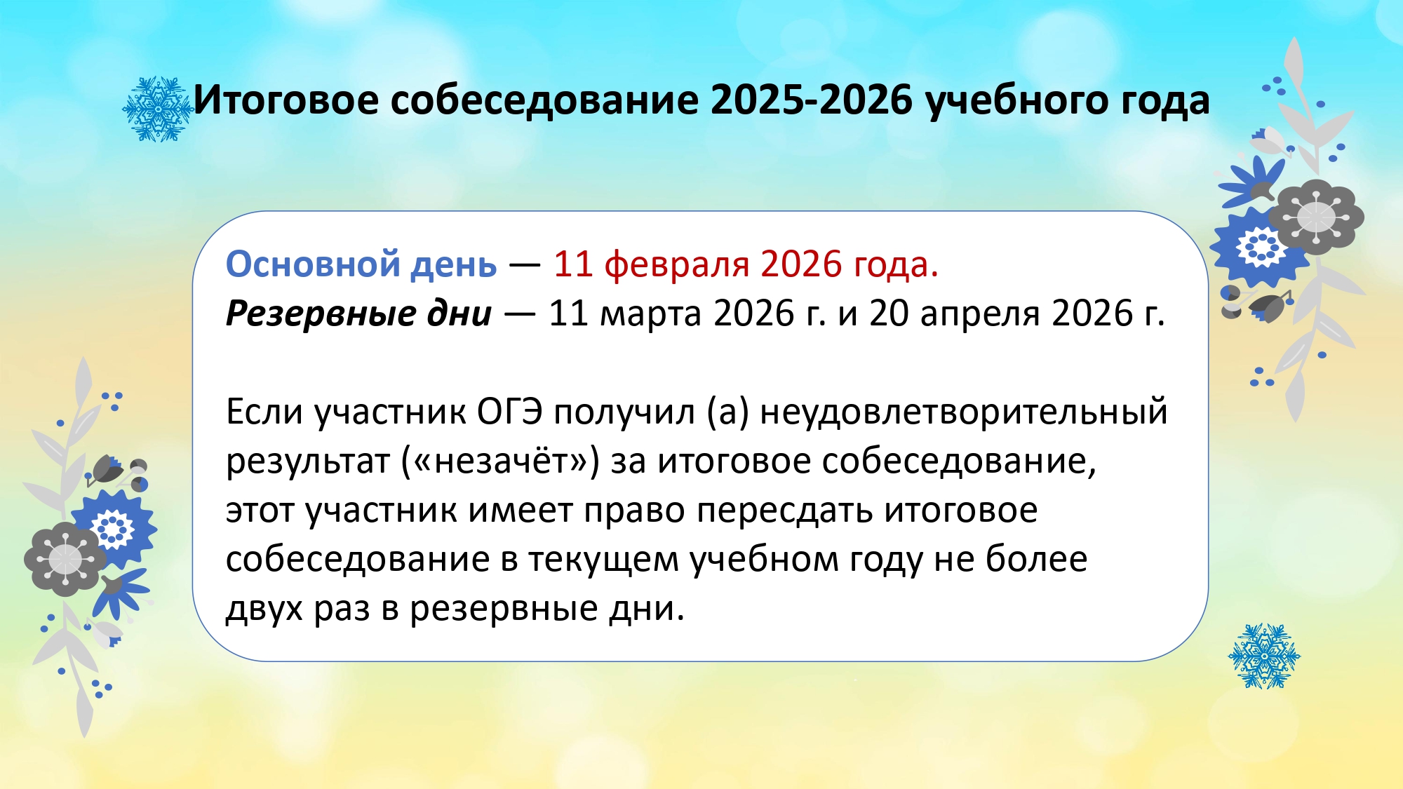 Для участия в итоговом собеседовании участники подают заявление не позднее чем за две недели до начала проведения итогового собеседования: